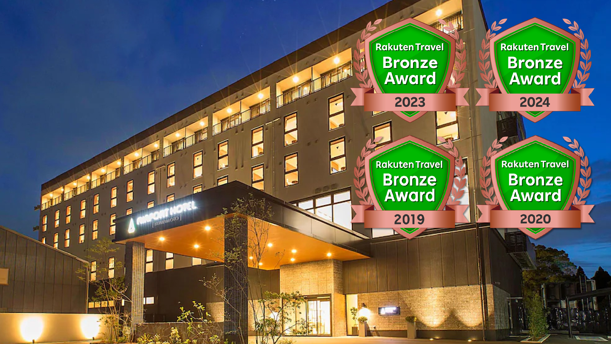 実際の宿泊者の評価:口コミ1669件・評価4.56・熊本空港車13分・全室禁煙・Wi-Fi・駐車場無料・阿蘇山・菊池温泉・熊本城の観光拠点ホテル