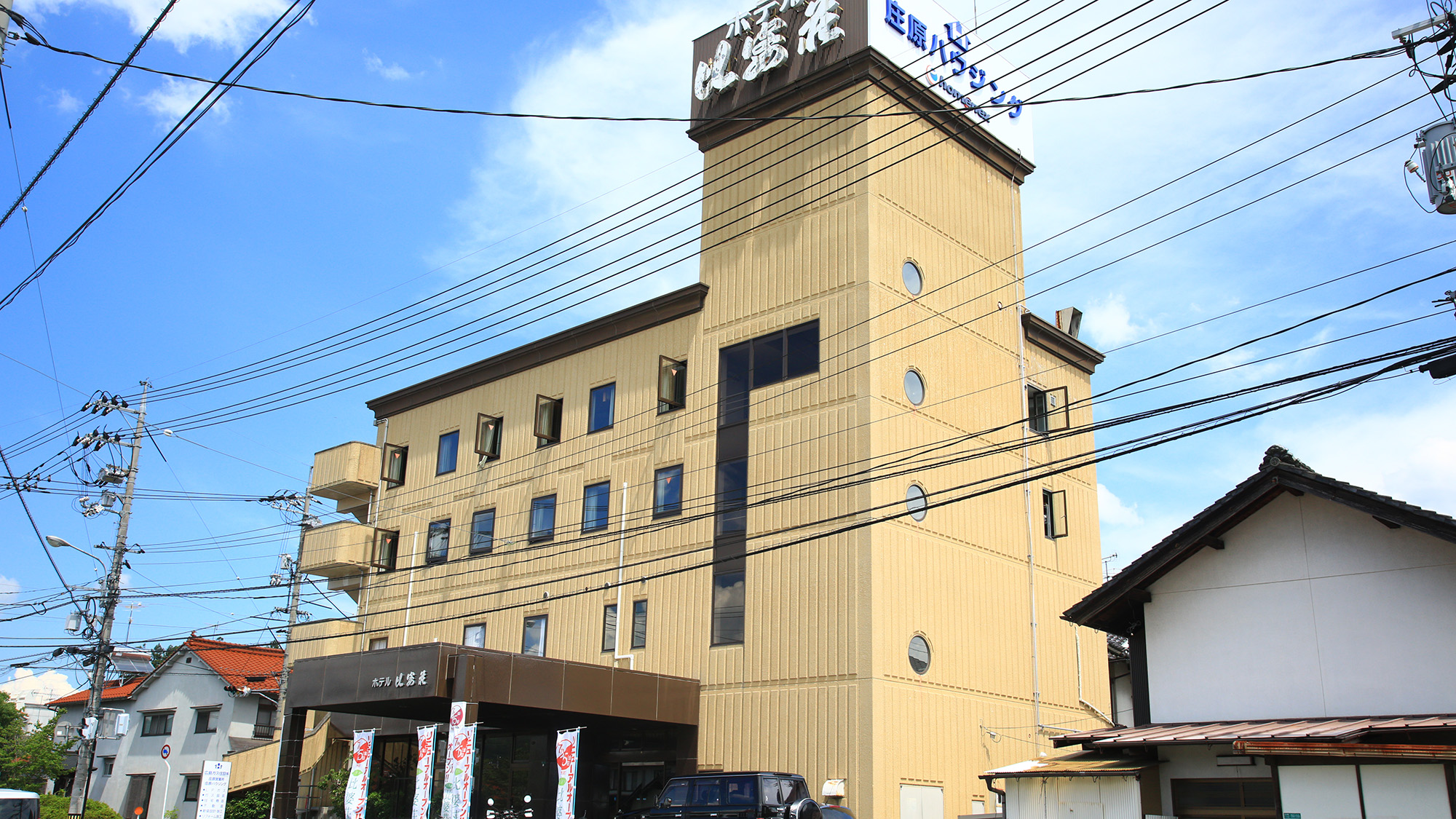 途中、庄原市図書館やスーパーマーケットを過ぎると、当ホテルが見えてきます。