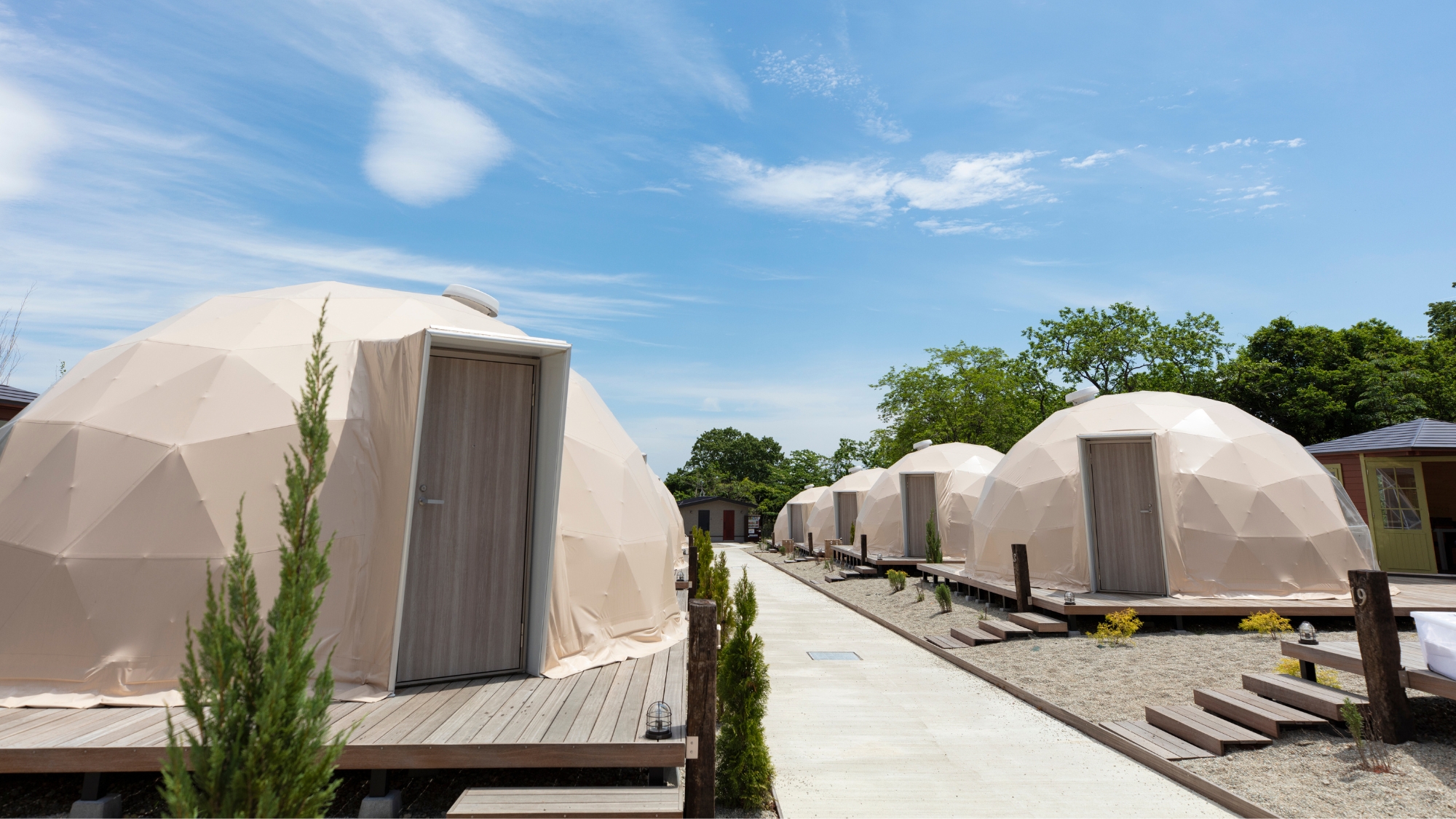 施設の特徴と設備 那須ハミルの森は、広大な敷地の中に、様々なタイプのグランピングテントが点在しています。
