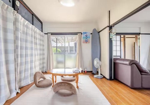 御宿ペットと泊まれる宿アジト/民泊は、千葉県鴨川・勝浦・御宿エリアで、愛犬と一緒にゆったりと過ごしたい方におすすめの古民家一棟貸しです。ビーチまで徒歩5分と好立地で、家族旅行やグループでの宿泊にも最適。