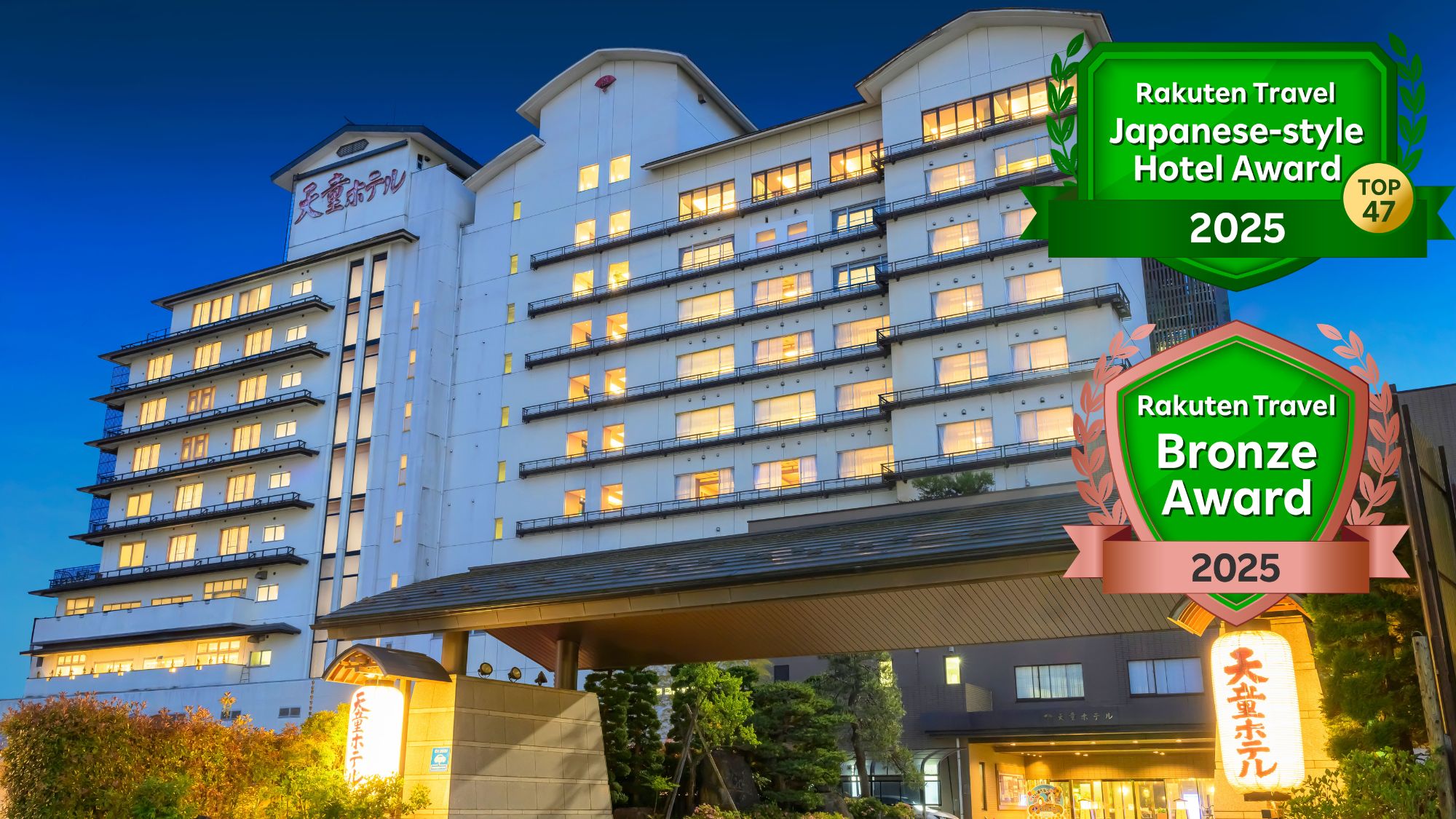 天童温泉 美味求真の宿 天童ホテルは、山形県天童市鎌田本町2-1-3に位置する、洗練された雰囲気の温泉旅館です。楽天トラベルの「ゴールドアワード」と「日本の宿」という栄誉を2024年にW受賞しており、その質の高さは折り紙付きです。